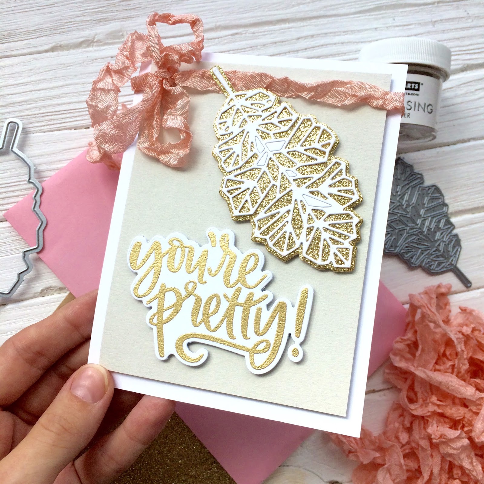 Совсем недавно я сделала открытку с этими же материала в рамках релизной недели Neat&Tangled (посмотреть можно тут), и какой же другой получилась эта. Просто не могу остановится использовать этот набор штампов. Ну а лист конечно же шикарен, да вы и сами видите. Получилось много золота - золотой кардсток и золотое горячее тиснение. А чтобы смягчить эффект добавила нежнейшей пудровой ленты; очень редко это делаю - но тут мне нравится, как она смотрится.